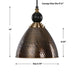 Transitional pendant of hammered antique brass finish on the metal shade with a textured black ball accent above the shade. 1-100 watt max, Edison socket. Bulbs not included. Supplied with 15' cord for adjustable installation.
