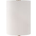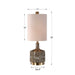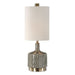 Finished in a crackled gray glaze, this ceramic table lamp echoes mid-century and contemporary styles. The base of this piece showcases an embossed repeating geometric design, accented with antique brass plated details. The round hardback shade is a white linen fabric with natural slubbing.