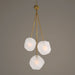 Three sizes of frosted geometric shaped glass give us the focal point for this celestial feeling 3 Lt. pendant. The glass sizes are small at 6", medium at 7" and large at 8" each suspended from a preset rod length accented with a rich matte antique brass finish. 3-60 watt max candelabra sockets. Bulbs not included. Supplied with 12' wire, 5' chain for adjustable installation.