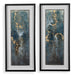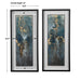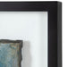 Inspired by natural gemstones, these metal sheets are hand painted in blue, turquoise, white and gold leaf. The raw metal edge is softened by oatmeal linen backing and a black shadow box style frame under glass. Due to the handcrafted nature of this artwork, each piece may have subtle differences.