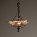Hand wrought, oil rubbed bronze metal curls around the heavy, handmade glass. Its amber tonalities are key in this exciting mix of materials. 3-100 watt max, Edison sockets.Bulbs not included. Supplied with 15' wire and 7' chain for adjustable installation.