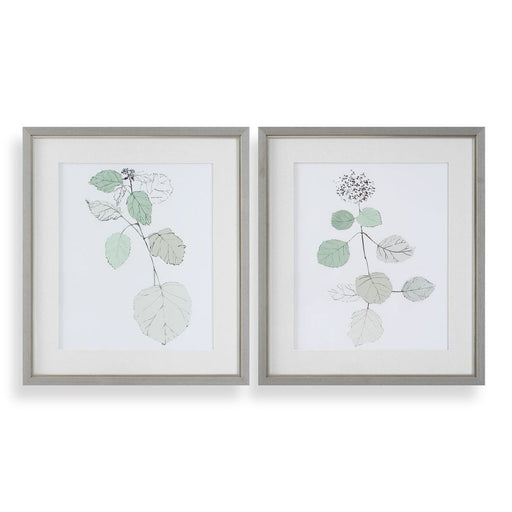 UttermostThis versatile pair depicts delicate botanicals in soothing sage, navy, and neutral tones. Each print is under glass and accentuated by an off-whit...