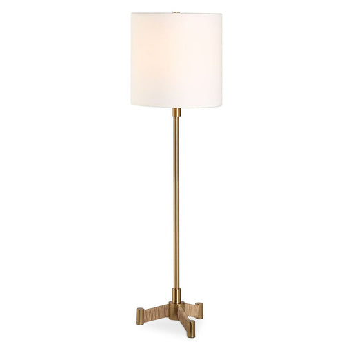 UttermostThis versatile buffet lamp showcases a plated brass slim metal base accented by rattan wrapped legs. The petite round hardback drum shade is a cris...
