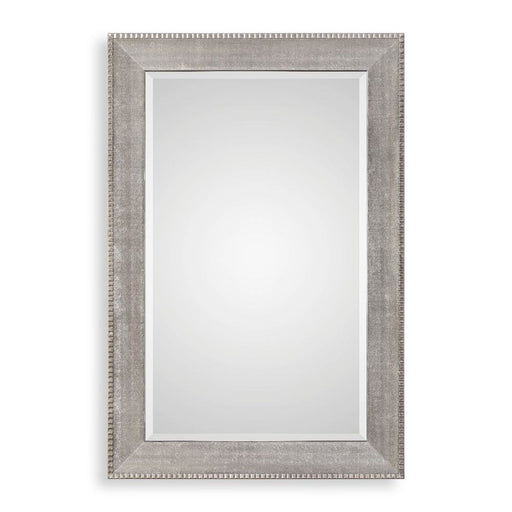 UttermostHeavily textured sloped profile finished in a metallic silver, accented with a fluted antiqued silver edge. Mirror features a generous 1 1/4" bevel...