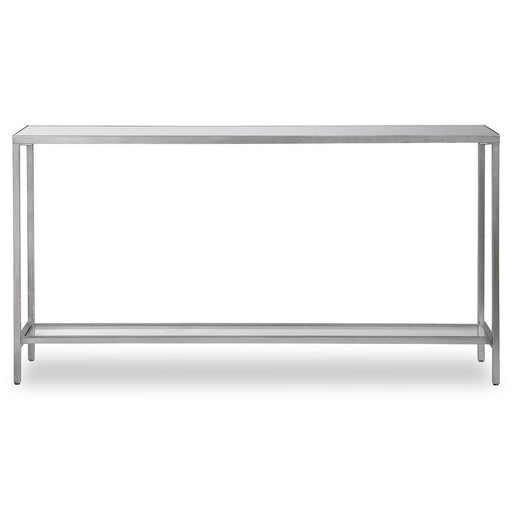 UttermostClassic and minimalistic, this narrow iron console table is finished with lightly antiqued silver leaf, inset with a beveled mirrored top, and gall...