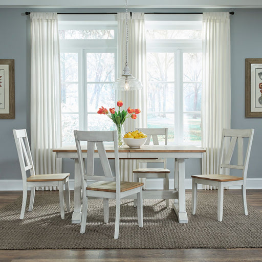 Liberty Furniture IndustriesWow family and friends with the Lindsey Farm five-piece trestle table set. Crafted of rubberwood solids and veneers, this set features a gray and s...