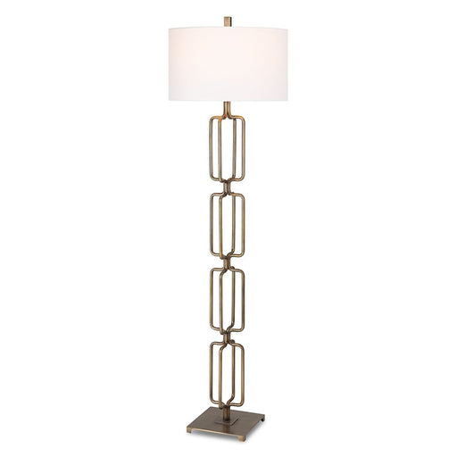 UttermostThe Link floor lamp features a unique design made from hand forged iron, finished in a heavily antique brushed gold. The hardback drum shade is cov...