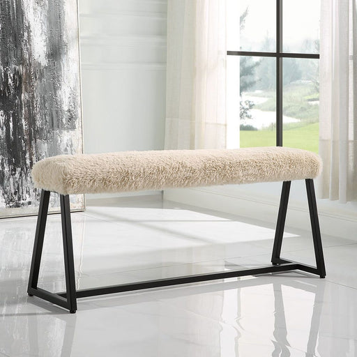 UttermostA space saving seating solution featuring a slim bench seat upholstered in plush long haired faux sheepskin in a toasty beige over a matte black fi...