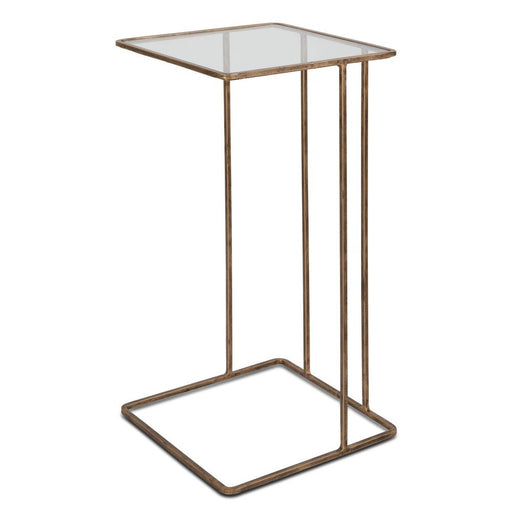 UttermostMinimally designed with versatility, this petite hand forged iron accent table is finished in heavily antiqued gold with a clear tempered glass top...