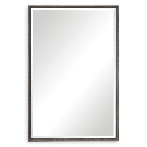 UttermostThis simple vanity mirror features an iron construction with detailed edges. The slight profile frame is finished in a distressed rustic black with...