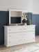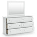 | Details | B139B47: Includes panel headboard/footboard and rails, Made with engineered wood (MDF/particleboard/plywood) and decorative laminate for the right balance of affordability and durability, Replicated solid white paint, Decorative laminate replicates natural or man-made material surfaces with consistent color, pattern and texture, Foundation/box spring required, sold separately, Mattress available, sold separately, Assembly required, B139B40: Includes dresser and mirror, Made of engineered wood (MDF/particleboard), Knobs with pewter-tone finish, Scalloped moulding, 6 smooth-operating drawers, Includes tipover restraint device, Mirror attaches to back of dresser; can also be mounted on wall horizontally or vertically, Safety is a top priority, clothing storage units are designed to meet the most current standard for stability, ASTM F 2057 (ASTM International), Drawers extend out to accommodate maximum access to drawer interior while maintaining safety, | |