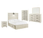 Details B192-46: Made of engineered wood (MDF/particleboard) and decorative laminate, Wispy white finish over replicated oak grain with authentic touch, Large-scale hardware with dark finish, 5 smooth-gliding drawers, Drawer interiors are lined with a faux linen laminate for a clean, finished look, Safety is a top priority, clothing storage units are designed to meet the most current standard for stability, ASTM F 2057 (ASTM International), Drawers extend out to accommodate maximum access to drawer interior while maintaining safety, B192-92: Made of engineered wood (MDF/particleboard) and decorative laminate, Wispy white finish over replicated oak grain with authentic touch, Large-scale hardware with dark finish, 2 smooth-gliding drawers, Drawers lined with faux linen laminate for finished aesthetic, 2 slim-profile USB charging stations, Power cord included; UL Listed, B192B1: Includes dresser with mirror, Made of engineered wood (MDF/particleboard) and decorative laminate, Wispy white finish over replicated oak grain with authentic touch, 6 smooth-gliding drawers, Drawer interiors are lined with a faux linen laminate for a clean, finished look, Large-scale hardware with dark finish, Mirror attaches to back of dresser, Assembly required, B192B34: Includes headboard, footboard, side storage, rails and slats, Made of engineered wood (MDF/particleboard) and decorative laminate, Wispy white finish over replicated oak grain with authentic touch, Large-scale hardware with dark finish, Decorative sconce light, LED with 3 AA batteries, 4 smooth-gliding storage drawers, 4 storage cubbies, 2 slim-profile USB charging ports, Power cord included; UL-listed, Bed does not require additional foundation/box spring; accommodates most zero clearance adjustable bases with the addition of a bunkie board, Mattress available, sold separately, Assembly required,