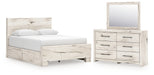 Details B2310B8: Includes panel headboard, panel footboard, 2 under bed storage units and roll slats , Made with engineered wood (MDF/particleboard/plywood) and decorative laminate for the right balance of affordability and durability, Rustic white finish over replicated reclaimed oak grain with authentic touch, Decorative laminate replicates natural or man-made material surfaces with consistent color, pattern and texture, 4 smooth-gliding storage drawers, Drawer interiors are lined with a faux linen laminate for a clean, finished look, Bed does not require additional foundation/box spring; accommodates most zero clearance adjustable bases with the addition of a bunkie board , Mattress available, sold separately, Minor assembly required, B2310B1: Made with engineered wood (MDF/particleboard/plywood) and decorative laminate for the right balance of affordability and durability, Rustic white finish over replicated reclaimed oak grain with authentic touch, Decorative laminate replicates natural or man-made material surfaces with consistent color, pattern and texture, Handles with dark pewter-tone finish, 6 smooth-gliding drawers, Drawer interiors are lined with a faux linen laminate for a clean, finished look, Framed front and pilasters, Safety is a top priority, clothing storage units are designed to meet the most current standard for stability, ASTM F 2057 (ASTM International), Drawers extend out to accommodate maximum access to drawer interior while maintaining safety, Mirror attaches to back of dresser; can also be mounted on wall horizontally or vertically , Minor assembly required,