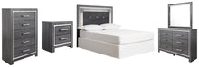 Reminiscent of Hollywood glamour of yesteryear, this bedroom set with full panel headboard, dresser/mirror, chest and nightstand interprets luxury in a decidedly modern way. Headboard details include button-tufted upholstery, faceted faux crystals and LED lights enhanced with remote-controlled settings for color and brightness. Chrome-tone drawer pulls and accents are a chic complement to the dazzling gray finish.