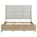 Transform your bedroom into a haven of sophistication with the Brentwood king upholstered bed. Crafted with meticulous attention to detail using Rubberwood solids and Split Heart White Oak veneers, this bed features a Sandstone finish. This bed is more than just a functional addition to your bedroom. It is a statement piece that brings sophistication and warmth to your personal haven. The standout feature lies in its unique design, with angled wood end panels on the headboard framing square upholstered panels. The warm wood end panels create a dynamic and eye catching contrast against the softness of the upholstered squares, forming a visually striking composition. Each square panel is meticulously upholstered in a luxurious Textured Taupe fabric, adding a touch of elegance and inviting tactile comfort. The neutral hue of the taupe ensures that this headboard seamlessly integrates into various bedroom styles, providing a versatile and enduring aesthetic. The marriage of wood and upholstery in this headboard creates a harmonious blend of texture, making it not just a visual delight but also a delight to touch. The angled wood end panels add a contemporary edge, while the plush upholstered squares exude comfort and coziness. Accentuating this artful design is a center overlay panel on the footboard, adding a layer of dimension and refinement to the overall composition. Another element of the footboard is the floating base, a design element that imparts a sense of lightness and modernity. The bases flow seamlessly into a saber foot, adding a touch of classic flair to the contemporary aesthetic. Indulge in the perfect fusion of form and function with the Brentwood king upholstered bed, where every detail tells a story of meticulous craftsmanship and thoughtful design, and speaks volumes about your discerning taste and appreciation for the finer things in life.