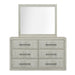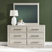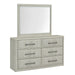 The Modern Play dresser and mirror combines contemporary style with thoughtful functionality. Constructed of durable Rubberwood solids with Paper Laminate in a Natural White finish, this set showcases soft shaping with gently rounded corners and pilasters. Each drawer features flat fronts with a center overlay panel for a symmetrical, modern look, complemented by sleek Bronze bar pull hardware. The top drawers include premium felt lining for delicate items, making this dresser as practical as it is stylish. Attach the mirror to the dresser with the included bolt on supports. A one inch beveled edge of the mirror adds a hint of sparkle, completing your stylish bedroom ensemble.