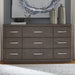 Elevate your bedroom décor to new heights of sophistication and comfort with the Cascade Falls 9 drawer dresser. Crafted with excellence using Rubberwood solids and Split Heart White Oak veneers, this dresser features a Satin Espresso finish. The bow shaping of the dresser adds a touch of soft contemporary flair, infusing the piece with graceful curves and understated charm. This subtle design element creates a sense of harmony and balance, enhancing the overall aesthetic of your bedroom space. Atop the dresser, a stunning starburst veneer pattern steals the spotlight, adding visual interest and sophistication. This intricate detail showcases the dresser's impeccable craftsmanship and attention to detail, making it a focal point of any room. Adding to its architectural appeal, reveal sections on the front and sides of the dresser offer glimpses of the finished frame, creating dimension and interest. These subtle accents elevate the dresser's design, making it a true work of art. Designed for both style and functionality, this dresser features soft-closing drawer guides for a gentle touch, ensuring smooth and quiet operation. The top drawers are lined with premium felt to protect delicate items, while the bottom drawers feature a cedar panel to keep your clothes fresh and fragrant. The drawers are accented with a custom Satin Nickel bar pull hardware. Softly rounded pilasters flow seamlessly into the inset bow-shaped plinth base, creating a cohesive and elegant look. The Cascade Falls 9 drawer dresser is a testament to refined craftsmanship and impeccable design, making it the perfect addition to any bedroom decor.