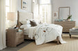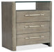 Organic and understated with a casual modern appeal, the Affinity Three-Drawer Nightstand contrasts a greige sand-blasted finish on Quartered Oak Veneers with a glass top shelf, accented by cream and pewter bar pulls. There’s a touch dimmer switch for your lamp.
