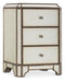 Enticing glam meets cool modern wit in the Arabella Nightstand. Finished in shimmery eglomise with heavily painted charcoal finish on the exposed wood edges, the top drawer has a drop-in felt liner, and the bottom drawer has a cedar bottom. There is one live USB port and three electrical outlets. One touch switch is located on each side of the case; there is a light underneath and a cord clip.