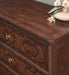 Celebrate the traditional soul and sophisticated beauty of Federal and Georgian design with this majestic Charleston Three-Drawer Nightstand adorned by inlay accents on the drawer fronts and updated for today with bun feet and tech-friendly features. Each of the 3 self-closing drawers has a cherry color interior. Crafted of Cherry, Walnut Veneers, Walnut Inlay and Olive Ash Burl, it features a vibrant Maraschino Cherry finish. There is a two-port USB Outlet on the back and a cord clip on the back.