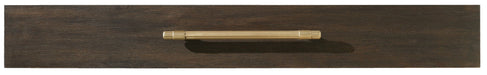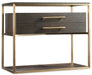 With a sophisticated and modern simplicity, the Curated Nightstand mixes materials of White Oak Veneers in a Midnight finish, brass-colored metal and glass for a curated chic look in an organic color palette. The single drawer with its two horizontal brass pulls looks like it is floating between the brass frame and the glass top for an architectural appeal.