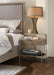 The delicately-scaled Elixir Leg Nightstand combines metal elements in a champagne silver finish with a soft gray finish applied to lightly sand-blasted walnut veneer for an organic and textured look. One drawer and two shelves. Faux shagreen is on the knob for a touch of intrigue.