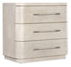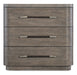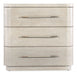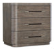 Softly sophisticated with a clean modern profile and luxe mixture of materials, the Modern Mood Nightstand is a stunning statement piece. The case has rounded corners and a plinth base and offers three self-closing drawers. Crafted of Oak Veneers, the nightstand is finished in the serene Diamond color and accented by metal pulls wrapped in leather.