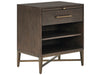The Montclair Nightstand features elevated design with one Embossed Cocoa drawer and a convenient pull-out shelf, all supported by an elegant Smoked Gold X-frame base. This piece exemplifies sophisticated material blending with practical bedside function.