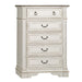 Design possibilities are endless with the Abbey Park queen panel bed, dresser, mirror, and chest. Crafted of poplar solids and cathedral white oak veneers, this kit features an antique white finish with heavy chipping and weathered brown whitewash tops, full extension drawers, premium felt lined top drawers and cedar lined bottom drawers, and is accented with antique pewter bail pull and drop ring hardware. The panel bed features heavy crown molding and raised panel accents framed by bead molding. The dresser has seven drawers and can equip the mirror that features a beveled edge with the included bolt-on supports. The chest offers an additional five drawers of storage. The blending of European traditional design influences makes Abbey Park a truly unique style for any living space.