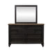 When details matter, choose the Americana Farmhouse optional dresser and mirror. Crafted of Poplar solids with White Oak veneers, this set features a wire brushed Black finish with worm hole distressing, full extension drawers with wood framed drawer fronts, premium felt lined top drawers and cedar lined bottom drawers, turned bun feet, and is accented with Antique Brass drop ring and knob hardware. This dresser offers nine drawers of storage with a bluff-cut center drawer for added visual interest. Attach the landscape mirror with its picture frame trim and beveled edge with the included bolt-on supports. Americana Farmhouse evokes a style unconstrained and intended to be personal with an authentic craftsman's flair and artistry.