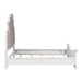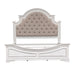 Accent your bedroom with the perfect blend of European Traditional design, using this unique upholstered panel bed. Upholstered in tufted chenille, laced with tones of white, tan and brown threading, this bed features an antiqued white finish with heavy chipping. The arched crowning and dog bone accents on each corner effortlessly add both definition and character, completing your look.