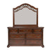 Elevate your home with the Messina Estates king poster bed, dresser, mirror, and nightstand. Crafted of rubberwood solids and birch veneers, this kit features a cognac finish, four way match fancy face veneer tops, canted corners, acanthus leaf onlays, wood framed drawer fronts, full extension drawers with felt lined top drawers, and is accented with antique brass bail pull hardware. The poster bed features large square posts with the acanthus leaf carvings accenting the top of the posts, and a scrolled metal accent in the headboard. The dresser has seven drawers and pairs well with the arched mirror detailing the same scrolled metal accent featured in the headboard. The mirror has a beveled edge and is secured by bolt-on supports. Place the three drawer nightstand next to your bed to achieve a sophisticated look. Add this European bedroom set to your luxury style home.