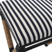 Rustic iron frame with a nautical touch, wrapped in natural fiber rope accents. Cushioned top is a sturdy, sailor-striped cotton in crisp navy and cream with performance treatment.