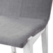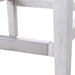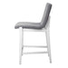 Gently sloped padded seat in a charcoal gray polyester performance fabric rests within a solid wood frame finished in aged white, with a brushed nickel metal kick plate.