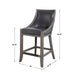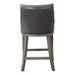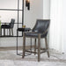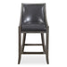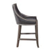 Versatile transitional styling, covered in a steel gray welt trimmed faux leather on a solid birch wood frame, hand finished in a weathered charcoal brown wash. Antique bronze metal kick plate.