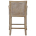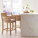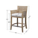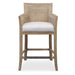 High supportive back and curvy flair arms make a grand style statement in a lightly glazed and bleached sandstone exposed hardwood finish with cane sides, tailored in a durable yet lush off-white fabric with added performance treatment to resist soiling and stains. Polished nickel metal kick plate.