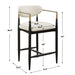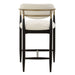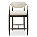 The sleek wraparound frame of the Moxie counter stool exudes style and sophistication. The tapered solid wood frame is finished in matte black and accented by metal arms in plated brushed brass. Its plush seat and back is upholstered in a finely textured off white, low pile velvet.
