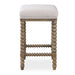 A casual statement counter stool featuring spindle turned legs and carved trim finished in a light walnut stain. Plush seat is tailored in a beige linen blend fabric with added performance treatment to resist soiling and stains, accented with brushed nickel nail head trim.