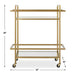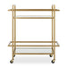 Entertain in style with the Erena Bar Cart. Its sleek brass finished stainless steel frame and two glass shelves provide ample space for serving drinks and showcasing your favorite bottles and glassware.