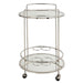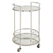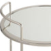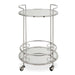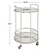 The Spritz Bar Cart rolls wherever the party goes! The metal cart is finished in polished chrome with dual mirrored shelves for optimal storage and display. The petite round frame sits atop rolling casters, enabling easy placement in any living or dining space.