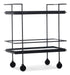 Industrial meets organic with the Commerce & Market bar cart. Offering a youthful sensibility and simple aesthetic, the bar cart combines a black metal frame and casters with a stone inlay top and bottom shelf.