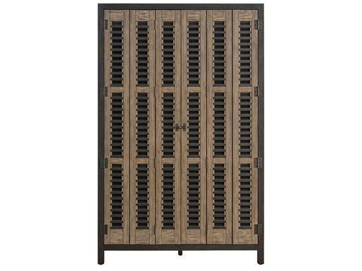 Universal FurnitureThe Dwell Bar Cabinet makes a striking statement with its shutter-style doors and mixed-material design. The contrasting dark wood frame and warm w...