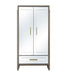 The Lansing Tall Bar Cabinet exudes modern-glam elegance with its cerused grey oak case and sleek mirrored doors, highlighted by brushed gold bar-pull hardware. Inside, an illuminated mirrored back panel adds sophistication, while dedicated storage for stemware and bottles ensures functionality. An additional drawer provides extra convenience, making this bar cabinet a stylish and practical addition to any entertaining space.