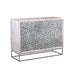 The Magnolia bar cabinet embodies a fusion of modern and bohemian styles, making it a standout piece in any space. Crafted from solid mango wood with a white-wash finish, its frame exudes a rustic yet refined charm. The touch-release doors reveal an intricately-patterned design crafted from contrasting bone and resin, adding an artistic flair. Supported by a textured solid iron base, the cabinet's interior features a crisp white finish and offers a variety of storage options for your bar essentials. As mango and bone are natural materials, each piece boasts unique variations in color, texture, and finishing, ensuring that your cabinet is one-of-a-kind. Elevate your home bar with this stylish and functional statement piece, perfect for those who appreciate modern design and natural materials.