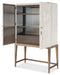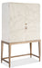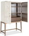 Transform your dining space with the elegant Dream Weaver Bar Cabinet from the Melange collection. Featuring a cream-colored finish with champagne accents, this modern masterpiece includes two textured doors with magnetic closures, a mirrored back panel, and LED lighting. Its two wood-framed glass shelves and a drawer provide functional storage, while tassel accents and tapered legs add a touch of sophistication. Perfectly designed to store bar essentials, this bar cabinet complements contemporary and transitional interiors, making it an ideal choice for entertaining.