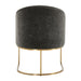 The Hanni dining arm chair features a sleek, curved steel frame in a brass plated finish and a barrel style seat upholstered in charcoal polyester velvet.