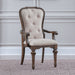 Get the perfect harmony of design and comfort that brings a touch of elegance to your dining space with the Provence Park upholstered arm chair. Meticulously crafted using Rubberwood solids, this chair features a Chateau Brown finish. The standout feature of this chair is its shaped wood-framed upholstered back and seat, adorned with button-tufted cream textured chenille upholstery. This meticulous detailing not only adds visual interest but also provides a plush and inviting surface for ultimate relaxation. The button tufting creates a captivating pattern, enhancing the overall richness of the chair's design. The scrolled arms add a touch of design flair, bringing a sense of elegance and refinement to the chair. These scrolled arms not only contribute to the chair's aesthetics but also provide additional comfort and support. The square turned tapered legs, featuring bead molding, showcase meticulous craftsmanship and add a timeless charm to the chair's design. Nylon chair glides are thoughtfully included to protect your flooring, ensuring that your investment in this chair extends to the preservation of your home. Whether you're hosting a formal dinner or enjoying a casual meal, the Provence Park upholstered arm chair offers both style and comfort in equal measure.