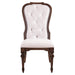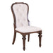 Get the perfect harmony of design and comfort that brings a touch of elegance to your dining space with the Provence Park upholstered side chair. Meticulously crafted using Rubberwood solids, this chair features a Chateau Brown finish. The standout feature of this chair is its shaped wood-framed upholstered back and seat, adorned with button-tufted cream textured chenille upholstery. This meticulous detailing not only adds visual interest but also provides a plush and inviting surface for ultimate relaxation. The button tufting creates a captivating pattern, enhancing the overall richness of the chair's design. The square turned tapered legs, featuring bead molding, showcase meticulous craftsmanship and add a timeless charm to the chair's design. Nylon chair glides are thoughtfully included to protect your flooring, ensuring that your investment in this chair extends to the preservation of your home. Whether you're hosting a formal dinner or enjoying a casual meal, the Provence Park upholstered side chair offers both style and comfort in equal measure.