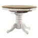 Reinvent your style with the Carolina Crossing pedestal table. Crafted of rubberwood solids, this set features a heavily distressed antique white finish with an antique honey top. The pedestal table has a 15” butterfly leave allowing the user to expand the round top into an oval top and is anchored by a turned pedestal base flowing into splayed feet. Carolina Crossing offers affordable solids in a perfect scale for smaller dining areas.