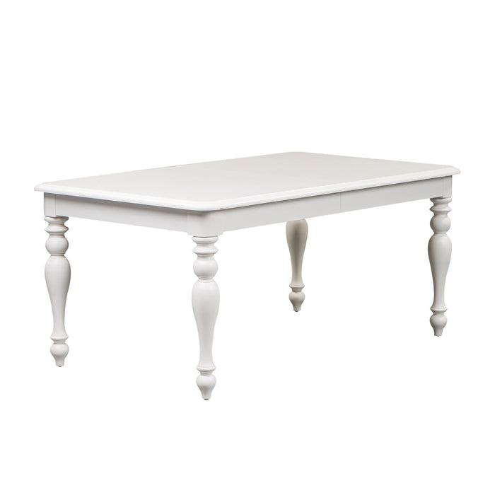 Be distinctively different with the Summer House five-piece rectangular table set. Crafted of poplar and rubberwood solids, this set features an oyster white finish and consists of the rectangular leg table and four splat back side chairs. The leg table features beautifully heavy turned legs and includes a removable 12” leaf. The chairs have a decorative splat back, a padded upholstered seat in linen fabric, and beautifully round turned legs with nylon chair glides to protect your flooring. With cottage design always in fashion, the Summer House collection would make a great addition to any home.